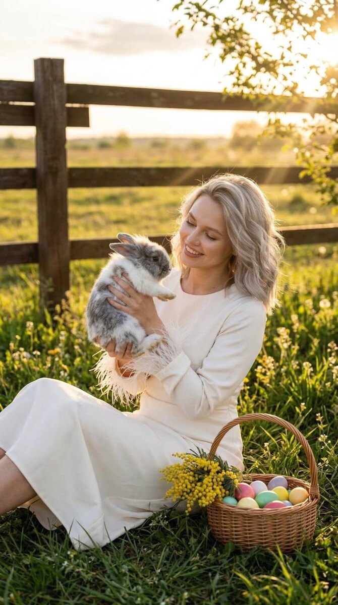 Модель: Nano Banana Сгенерировать🪄 девушка с идеальным макияжем, идеальным тоном лица, сидит на траве, сзади виден фон забора и поля, девушка одета в красивое эстетичное бело-молочное платье с перьями на руках, рядом с ней стоит корзинка с разноцветными яйцами и маленьким букетом мимоз внутри, девушка держит пушистого живого зайца серо-белого цвета. Смотрит на него и слегка улыбается, она довольная. Свет красиво падает на нее лучами, атмосфера уютная