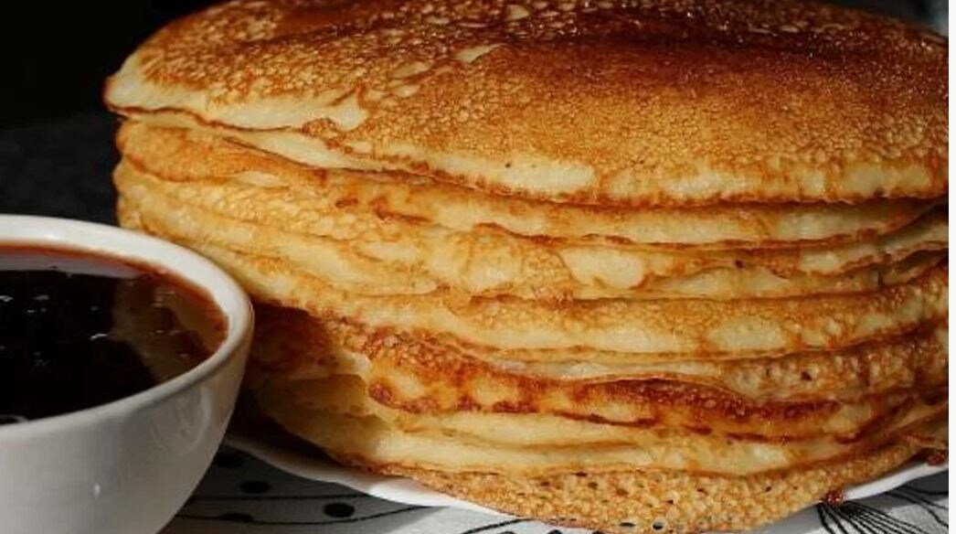 - 500 - 600 г муки; - 1 литр молока; - 2 яйца; - 1 пакетик сухих дрожжей; - 2 ст. ложки сливочного масла; 0,25 стакана растительного масла; - сахар; - соль. Молоко слегка подогреть, добавить дрожжи, яйца, сахар и соль по вкусу, тщательно перемешать. Дать настояться около 20 минут, затем влить растительное масло и растопленное сливочное масло. Перемешивая, ввести понемногу муку. Перемешать тесто так, чтобы не осталось комком. Выпекать на сухой раскалённой сковороде.