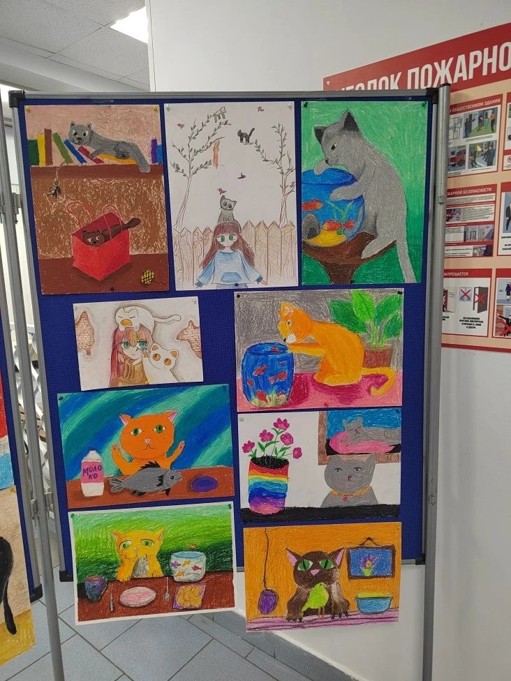 , мартовский котёнок... Он на солнышко глядит, прямо как ребёнок... " 😻 Лора Татаурова Друзья! 🍀 В царстве красок и карандашей царит настоящий переполох! Коты всех мастей и пород разгуливают по листам бумаги в холле начальной школы. Это не случайность — это итог большого творческого проекта студии Анны Александровны Сурковой 🎨 1 марта в России отмечается День кошек — неофициальный, но очень любимый в народе праздник, посвященный самым грациозным, загадочным и независимым домашним питомцам. История этого праздника в России сравнительно молодая. По данным Российского этнографического музея, в первый день весны его начали отмечать в 2004 году. Инициаторами были Московский музей кошки и редакция журнала «Кот и пес» 😽 Наша выставка «От уса до хвоста» — взгляд детей на этих замечательных домашних питомцев. Каждый рисунок — это история дружбы и даже целое приключение! У всех котиков получился очень индивидуальный характер, свой цвет и настроение! Специалисты по поведению кошек гово