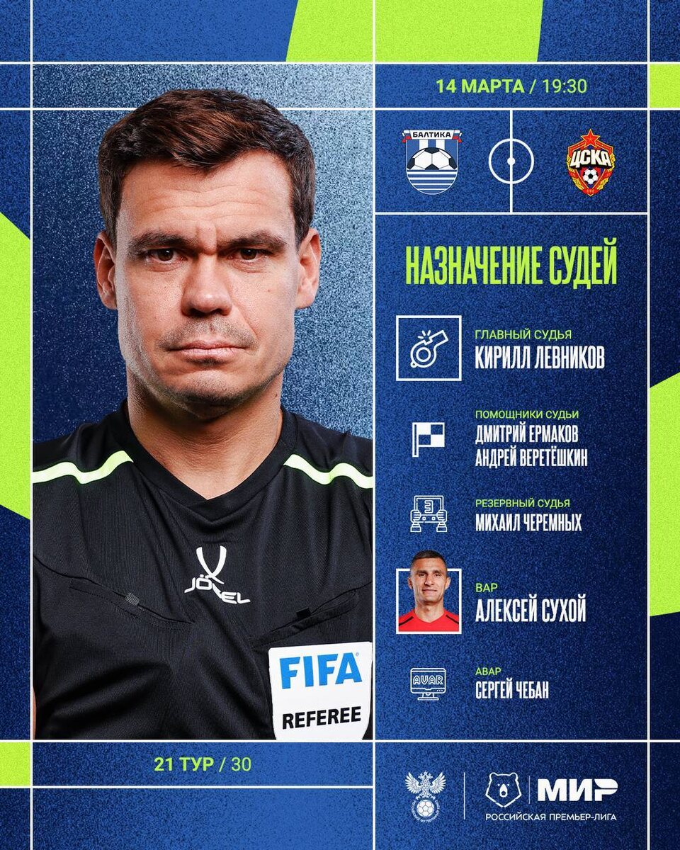 : 🚩 Главный судья — Кирилл Левников; 🏳 Помощники судьи — Дмитрий Ермаков, Андрей Веретёшкин; 🏳 Резервный судья — Михаил Черемных; 📺 VAR — Алексей Сухой; 👀 AVAR — Сергей Чебан. В качестве главного судьи Кирилл Николаевич обслужил 10 матчей с участием Балтийцев. В этих встречах наша команда одержала четыре победы и три раза сыграла вничью. Всего в матчах с участием «Балтики» было показано 23 жёлтые карточки.