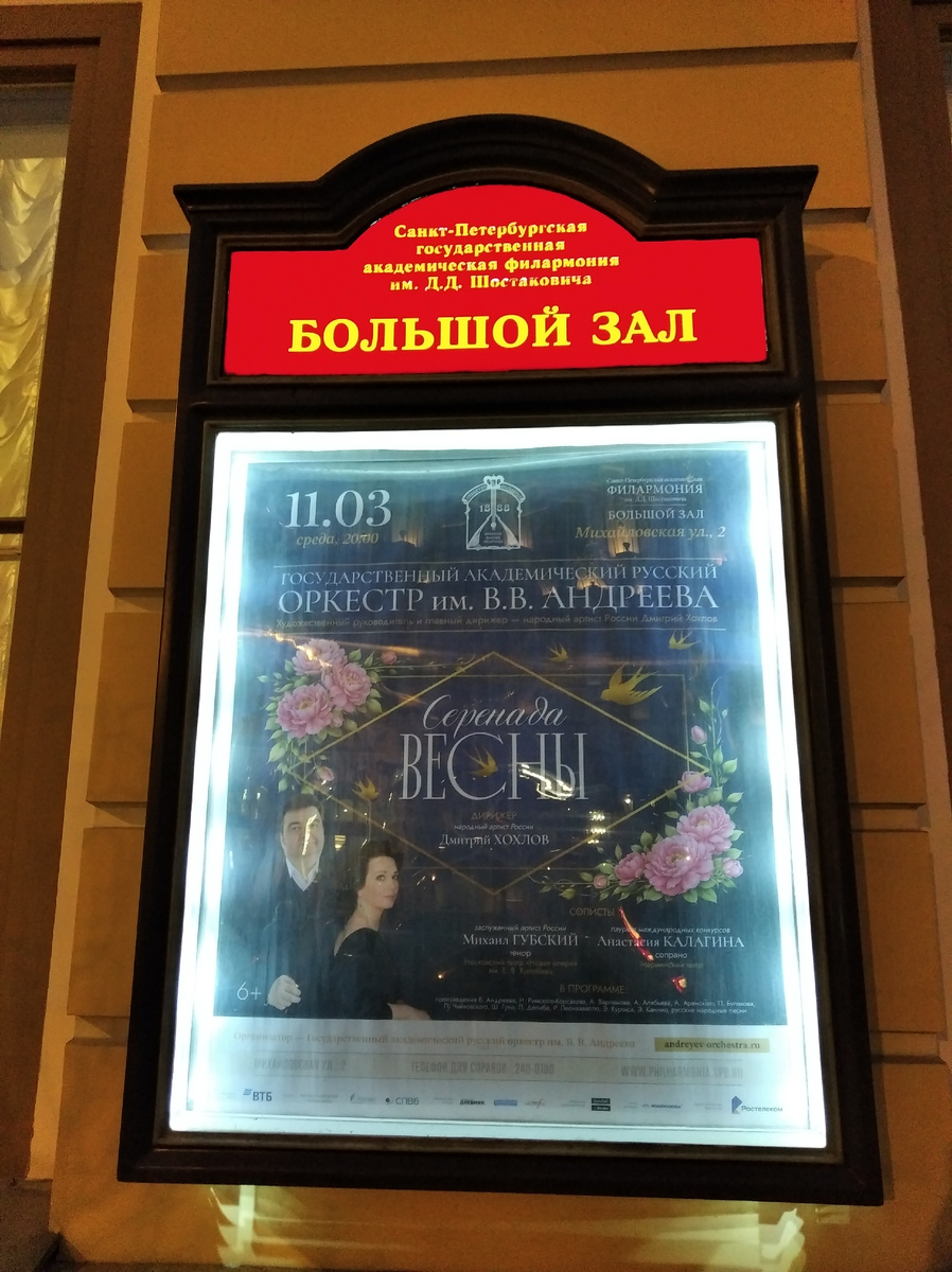 В сегодняшнем концерте принимали участие оркестр им. Андреева и солисты: Михаил Губский, Анастасия Калагина.