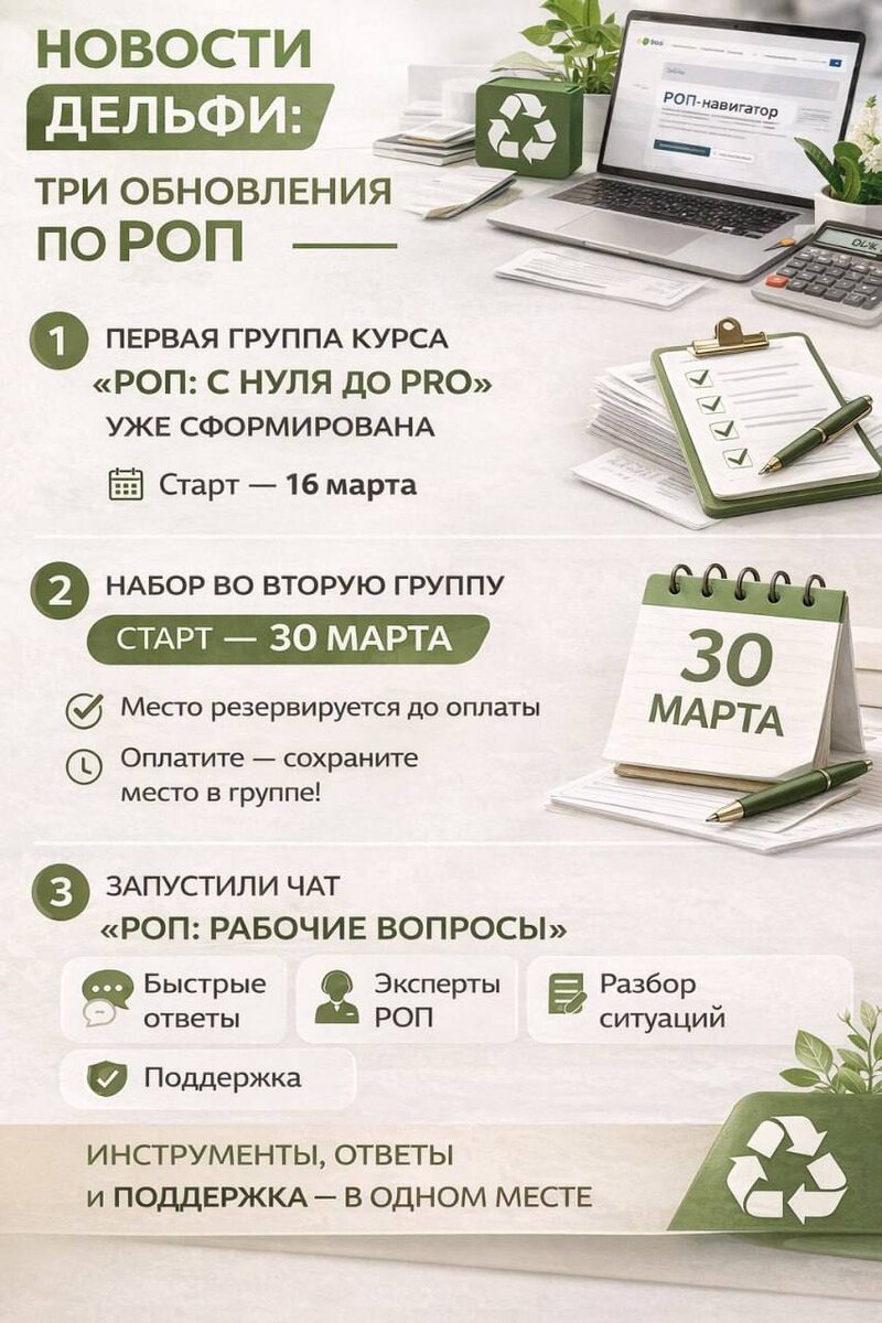 📣 ▶️ Новости Дельфи: три обновления по РОП Коллеги, делимся несколькими новостями по нашим инструментам и программам РОП. 1️⃣ Первая группа курса уже сформирована Полностью сформирована первая группа курса «РОП: с нуля до PRO для новичков». Старт — 16 марта. Мы открываем набор во вторую группу, которая стартует 30 марта. Если вы уже записались, но ещё не оплатили участие, обратите внимание: место в группе резервируется 🚩 только до момента оплаты. После старта группы 16 марта места могут перейти участникам из следующего потока. 🔗 https://delfi-law.ru/rop-course-novichok 2️⃣ Новый инструмент на сайте — РОП-навигатор В нашем РОП-навигаторе появился новый инструмент (тестируем его с вашей помощью). Теперь можно быстро проверить: • подпадает ли товар или упаковка под РОП • находится ли код в классификаторах • относится ли он к перечням ПП РФ № 2414 Достаточно знать код ТН ВЭД или ОКПД2. 🔗 https://delfi-law.ru/ropnavigator 3️⃣ Запустили рабочий чат «РОП: рабочие вопросы»