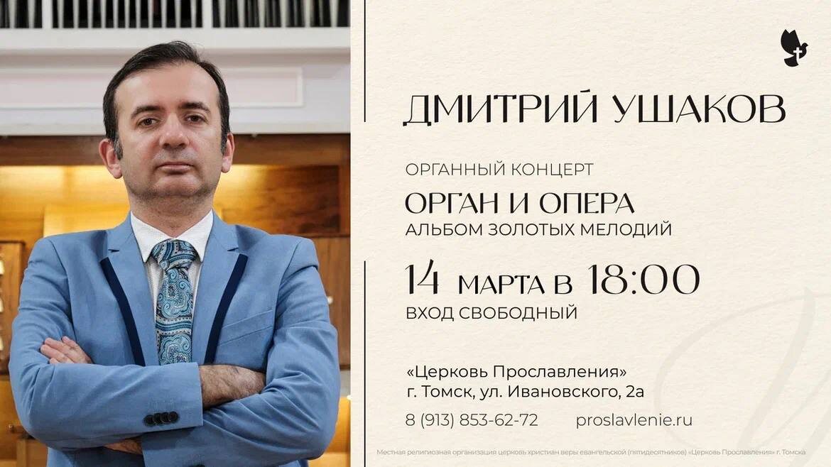 🔸 Оперные шедевры в переложении для органа! 🎹 14 марта в 18:00 приглашаем вас на уникальный концерт «ОРГАН И ОПЕРА. Альбом золотых мелодий». Программа «Альбом золотых мелодий» — это настоящая шкатулка с драгоценностями. Здесь и волшебство Глинки, и благородство Генделя и Верди, и северный эпос Вагнера. За инструментом — Дмитрий Ушаков — лауреат всероссийских и международных конкурсов, лауреат Всероссийской премии "Органист года", солист Томской филармонии, руководитель органного класса Томского государственного университета, органист храма Покрова Пресвятой Богородицы. 📍Место: «Церковь Прославления», г. Томск, ул. Ивановского, 2а 👨👩👧👦 Поддержать проведение концертов органной музыки можно добровольным пожертвованием по окончании вечера.