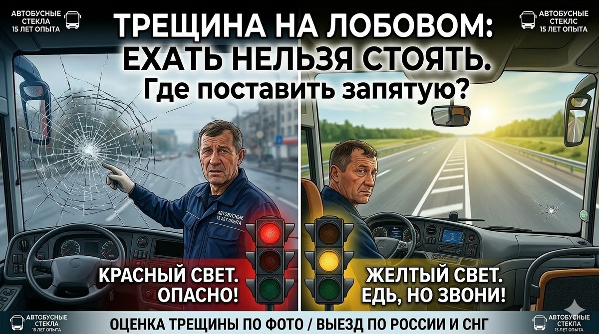 Представьте: утро, предрейсовый осмотр, а на лобовом стекле красуется трещина от вчерашнего камня. И тут начинается спор: «Мы в рейс-то выходим или как?». Механик перестраховывается, владелец не хочет терять деньги за отмененный тур, а водителю с этим стеклом ехать в ночь. Давайте без эмоций разберем, когда стекло можно временно «потерпеть», а когда выезд с базы — это преступление против безопасности (и бюджета). КРАСНЫЙ СВЕТ: Ехать нельзя (вообще никак) Трещина или скол в зоне дворников со стороны водителя. Это не просто моя рекомендация, это жесткое требование ГОСТа и ПДД. Если повреждение находится прямо перед глазами водителя в зоне очистки стеклоочистителей — эксплуатация запрещена. Автобус не пройдет техосмотр, а на трассе первый же инспектор ДПС выпишет штраф и имеет полное право завернуть рейс. Трещина дошла до края стекла. Лобовое стекло в современных автобусах — это не просто щиток от ветра, это несущий элемент кузова, который придает ему жесткость. Если трещина уперлась в кр