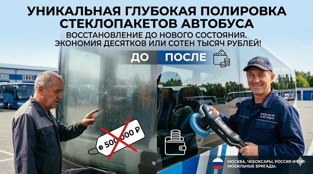 Хочу поговорить про нашу самую востребованную, но для многих всё ещё непривычную услугу — глубокую полировку боковых стеклопакетов. Вы наверняка не раз видели эти мутные, затертые окна на туристических или междугородних рейсах. Пассажир покупает билет, хочет любоваться пейзажами, а в итоге смотрит на паутину из царапин. Появляются они быстро: от агрессивной химии на мойках, жестких щеток, веток на узких дорогах. Из-за таких стекол даже свежий автобус выглядит неопрятным и старым. Какая первая мысль возникает у владельца автопарка? «Придется менять». А теперь давайте считать деньги. Замена одного большого бокового стеклопакета — это приличная сумма (само стекло, доставка, работа по вклейке). А если затерта вся сторона? А если весь автобус? Счет моментально улетает в сотни тысяч рублей. И не забывайте про простой техники, пока нужные стекла едут под заказ. Именно поэтому мы активно развиваем услугу выездной полировки. Это чистая математика и выгода для бизнеса. Как это выглядит на практи