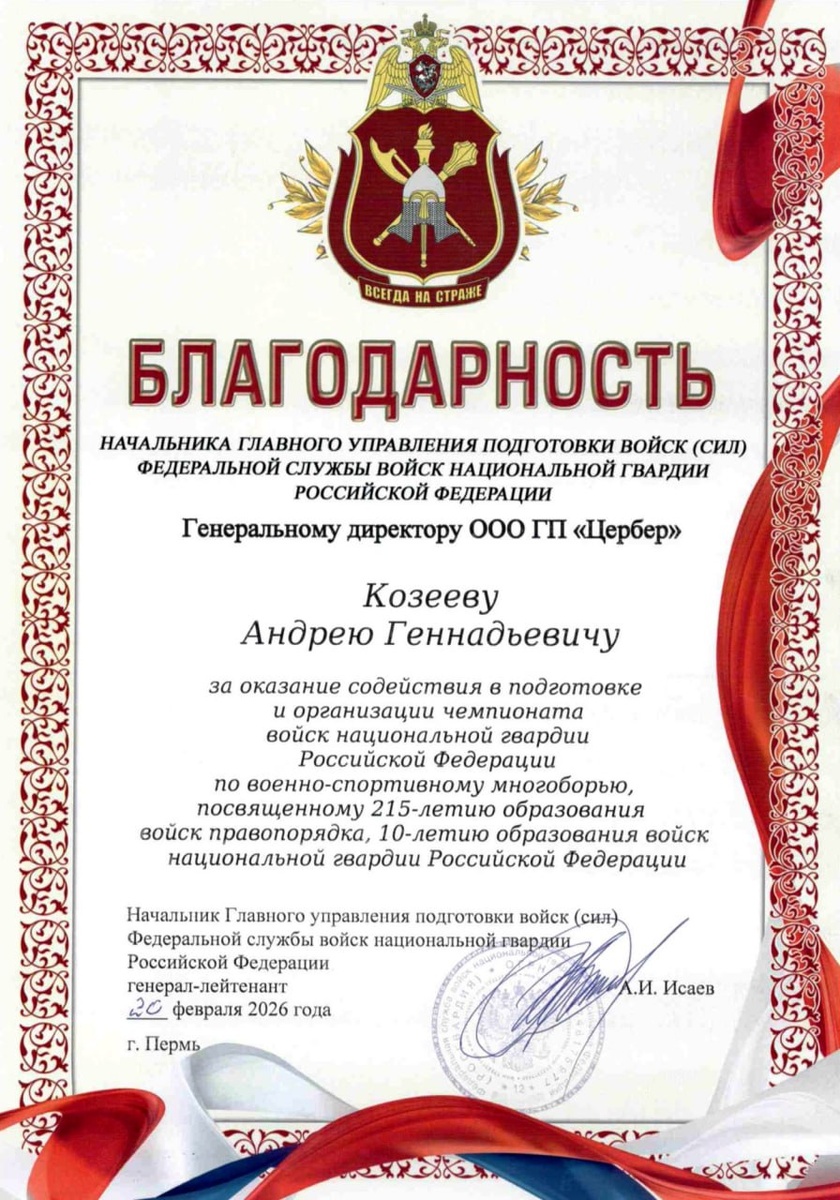 В адрес Генерального директора группы предприятий «Цербер» Козеева Андрея Геннадьевича поступила Благодарность за подписью Начальника Главного управления подготовки войск (сил) Федеральной службы войск национальной гвардии Российской Федерации генерал-лейтенанта А.И. Исаева со словами благодарности за оказание содействия в подготовке и организации чемпионата войск национальной гвардии Российской Федерации по военно-спортивному многоборью, посвященному 215-летию образования войск правопорядка, 10-летию образования войск национальной гвардии Российской Федерации. #Цербер #благодарность #Пермь #охрана #спорт #новости #Росгвардия #чоп Цербер — на страже безопасности 👉 Подписаться на канал