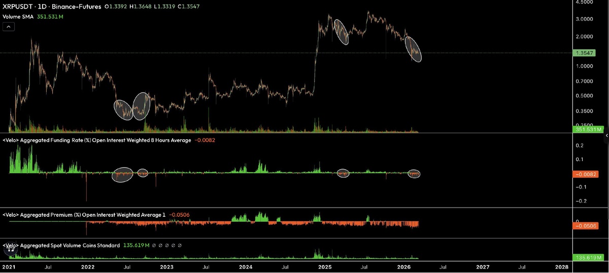 🎯 Отрицательное фондирование XRP продолжается, падение до уровней, невиданных с 2022 года