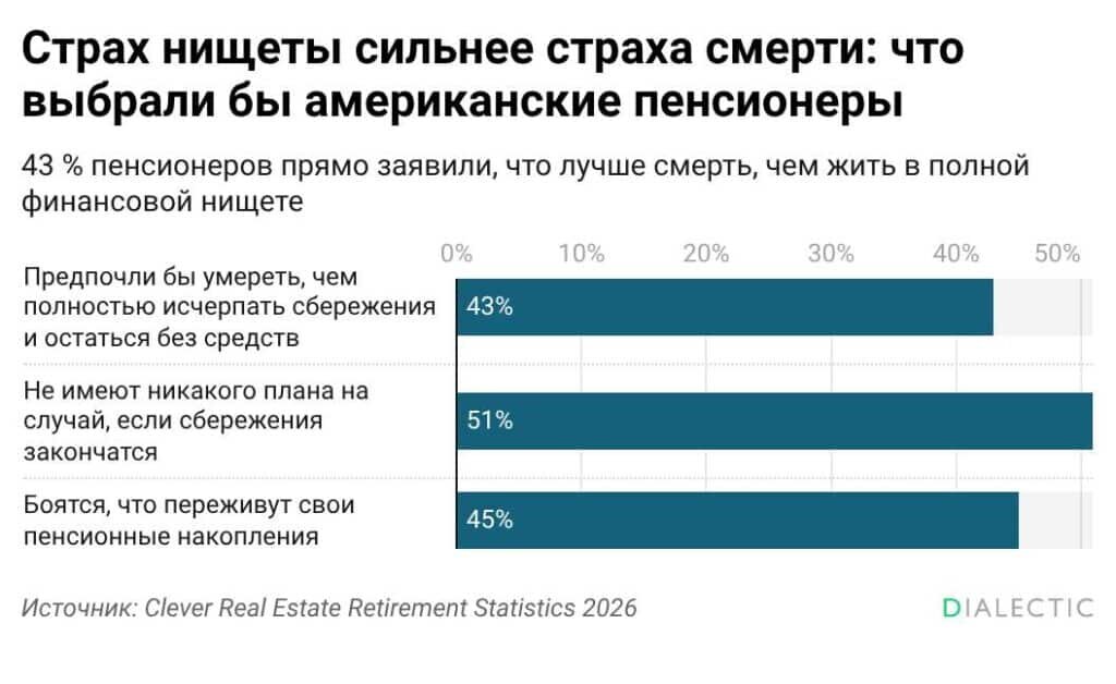 Страх перед полным финансовым крахом стал доминирующим чувством среди пожилых жителей Соединенных Штатов. Об этом сообщает аналитический портал Clever Real Estate. Согласно результатам свежего исследования, 43% американских пенсионеров признались, что предпочли бы смерть полной потере пенсионных накоплений. Ситуация усугубляется отсутствием четкого плана действий в критической ситуации: 51% опрошенных не знают, что будут делать, когда деньги закончатся. При этом 45% респондентов всерьез опасаются, что продолжительность их жизни окажется больше, чем хватит отложенных на старость средств. За последний год ожидания граждан относительно стоимости комфортной жизни на пенсии резко возросли. Если в 2025 году американцы считали достаточной сумму в 580 тысяч долларов, то в текущем году эта планка поднялась до 823 тысяч. В реальности же средние накопления пенсионеров составляют всего 288 тысяч долларов, а около 29% пожилых людей вовсе не имеют никаких сбережений. Такое несоответствие желаемого и