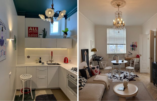Современный уютный интерьер, в котором сохранили дух сталинской эпохи Эта квартира находится в знаменитом доме преподавателей МГУ на Ленинских горах — памятнике сталинской архитектуры 1953 года постройки. Сегодня здесь живет девушка-режиссер. Перед дизайнером Наной Харгияновой стояла интересная задача: создать современный, функциональный интерьер, сохранив при этом аутентичные элементы послевоенной архитектуры и органично соединив их с актуальными предметами мебели. В квартире есть прихожая, небольшой холл, отдельная кухня, гостиная, спальня и совмещенный санузел. Кухня площадью 5,5 кв. м — внутреннее помещение без окна, с единственной маленькой форточкой под потолком. Пространство здесь удалось организовать максимально функционально, вместив много хранения и всю необходимую технику: отдельно стоящий холодильник, духовый шкаф с функцией СВЧ, посудомоечную машину и компактную варочную панель на две конфорки. Кроме того, удалось найти место для стиральной машины, интегрированной за одним