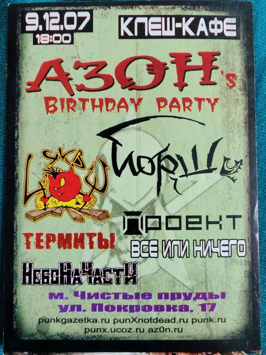 ». Подпишитесь на наш канал. В 2007 году после празднования 7-летия группы Азон, клуб, где мы выступали, прекратил существование. Физически. У нас вообще долго не складывалось с празднованием Дней рождения группы. То клуб прямо перед концертом опечатают какие-то громилы в бронежилетах, то свет во всём районе вырубят, то сломается что-нибудь ещё. С празднованием семилетия поначалу всё шло вполне гладко. Даже слишком. Мы арендовали только что открывшийся клуб, «ХХХХ-ХХХХ» на Чистых прудах, позвали в гости дружественные коллективы, и с первого же взгляда было понятно, что мы, видимо, соберем неплохо народу. Вкинувшись в дополнительную рекламу, мы принялись репетировать специальную праздничную программу. Группы-гости также готовили нам подарки - в виде своих версий наших песен. Проблем возникало на удивление мало, и это настораживало. Мы строго расписали длительность сетов всех групп, исходя из договоренности: клуб отводил нам время с 18 до 22 часов. Всё по стандарту. Перед началом конце
