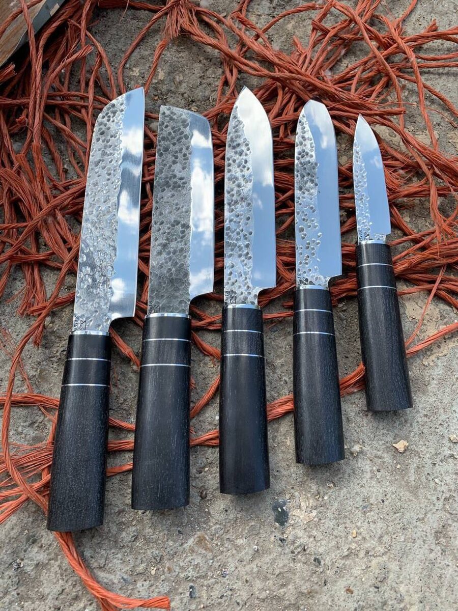 🔥 Настоящий характер начинается с деталей. Японские ножи из кованной стали 95х18 — выбор тех, кто ценит безупречный рез, баланс и эстетику ручной работы. Это не просто кухонный инструмент — это продолжение руки мастера. ⚔️ Почему именно они: ⛓️ Рукоять из граба (возможна светлая карелка) — тёплая, надёжная, с живой текстурой ⛓️ Кованная нержавеющая сталь 95х18 — отлично держит заточку и не боится влаги ⛓️ Твёрдость 58 HRC — идеальный баланс реза и износостойкости ⛓️ Подходят как для дома, так и для профессиональной кухни 🚩 Ножи можно приобрести по отдельности — соберите свой идеальный набор 📐 Размеры: mm ▫️ Общая длина: 305 / 335 / 335 / 285 / 285 ▫️ Длина клинка: 173 / 205 / 200 / 150 / 150 ▫️ Ширина клинка: 47 / 38 / 27 / 42 / 53 ▫️ Обух: 2,4 / 2,4 / 2,4 / 2,4 / 2,4 ▫️ Толщина рукояти: 33 / 33 / 33 / 34 / 33 ✍🏻 По вашему желанию сделаем гравировку на клинке или инкрустацию на рукояти — нож с характером и историей 🌲 Деревянная подставка подчеркнёт статус и станет украшением
