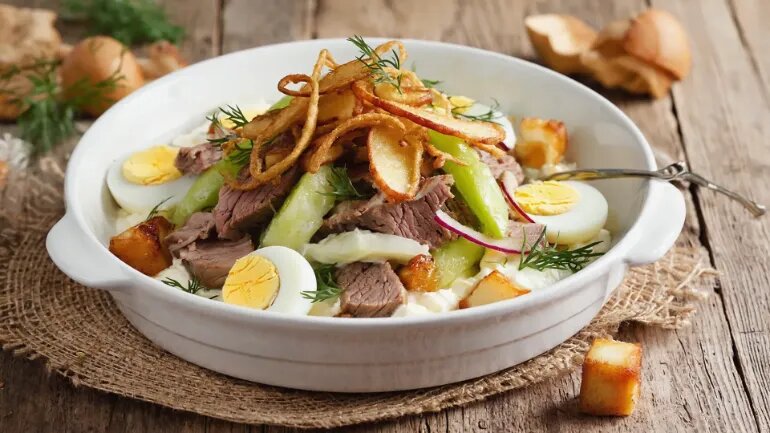 Этот рецепт — моя интерпретация классического мясного салата. Секрет здесь в текстуре и неожиданном сладком акценте.
