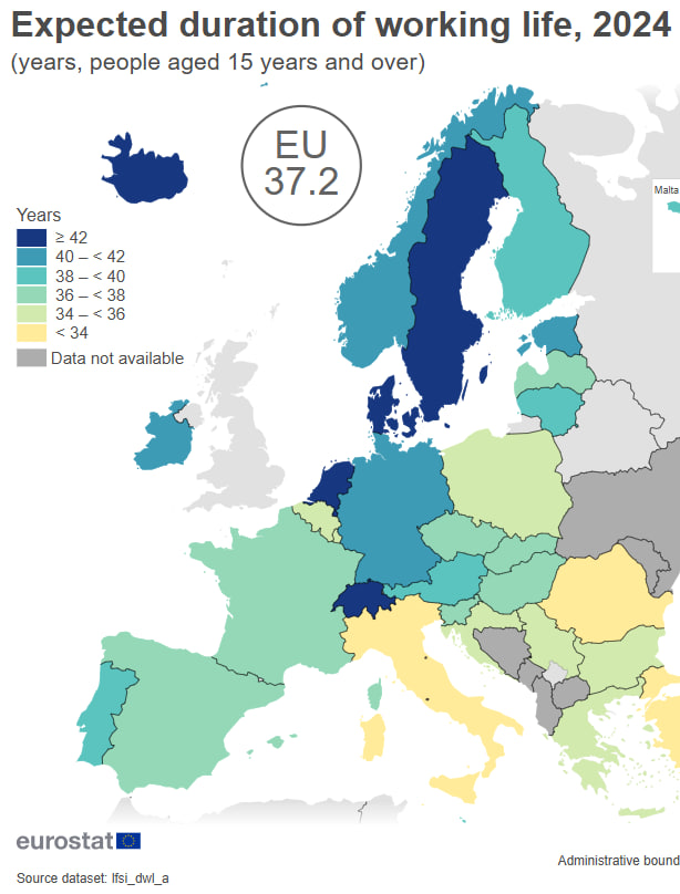 Телеграм канал HR-аналитики | НАШ КАНАЛ В VK Есть ещё две интересные метрики, которые хорошо показывают устройство рынка труда. Первая — ожидаемая продолжительность трудовой жизни. То есть сколько лет в среднем человек работает за свою жизнь. Разница в 10 лет! Один швед работает (приносит ценности государству) на 31, 1% - давайте посчитаем это в рублях и оценим ценность медицины. Разница между странами — больше 10 лет трудовой жизни. В России есть только выборочные обследования Росстата: Т.е. Россия на уровне Южной Европы В России исследования показывают 7-8 лет, т.е. мы гибрид: по этому показателю мы ближе к Северной Европе, по общему стажу к Южной Фактически Европа делится на две модели рынка труда. Северная Европа Почему это важно Чем чаще люди меняют работу, тем быстрее экономика адаптируется к изменениям. Во многих странах основной рост зарплаты происходит при смене работодателя, а не внутри компании. Рынки труда с коротким стажем у одного работодателя обычно имеют: И вы, навер