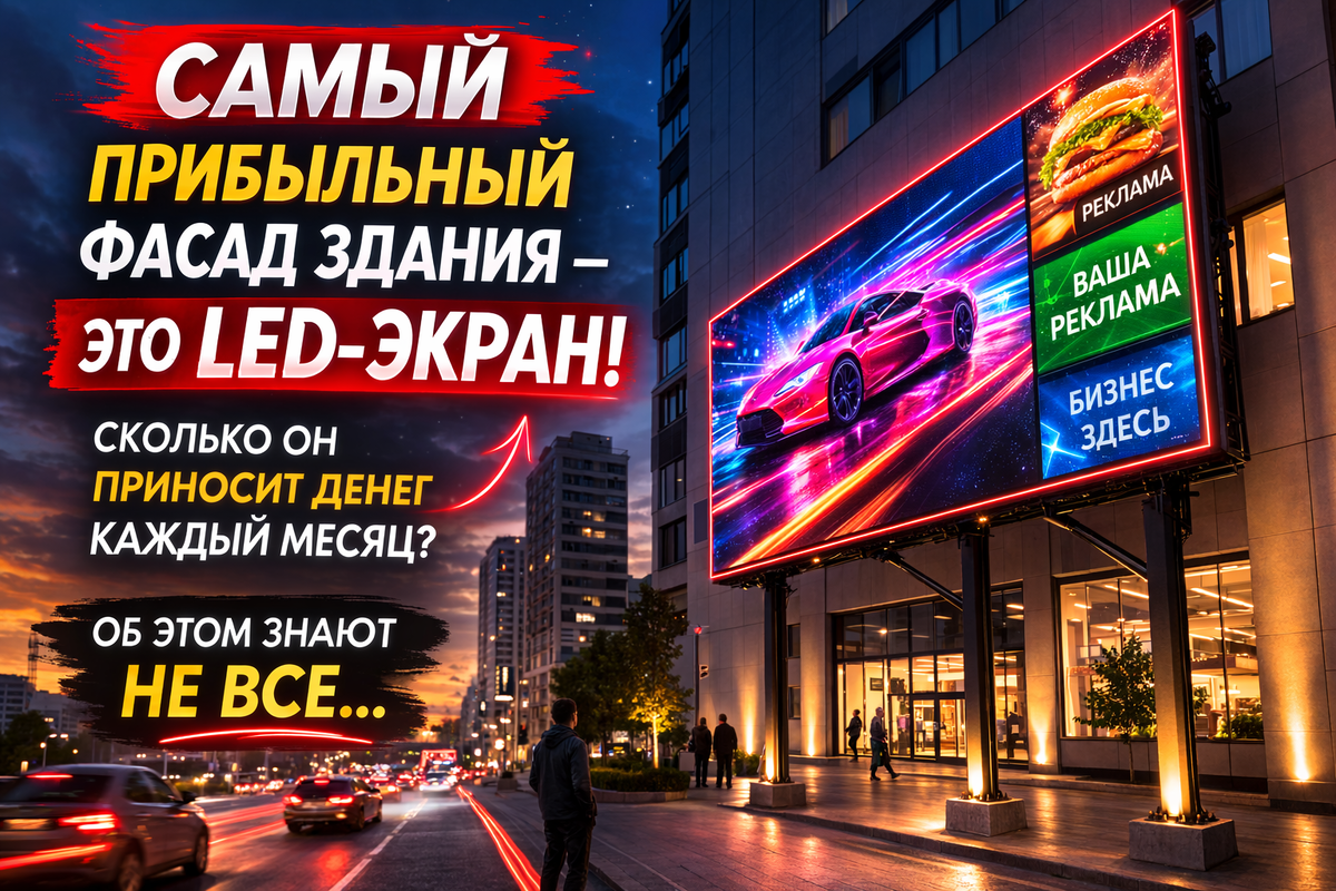 И это самая распространённая ошибка в коммерческой недвижимости. Пока одни владельцы просто вешают вывеску, другие устанавливают LED-экраны и начинают зарабатывать на рекламе. Разберёмся, сколько это реально приносит и почему всё больше зданий превращаются в медиафасады. Наружная реклама существует десятки лет: Но у них есть одна проблема — на них можно разместить только одного рекламодателя. LED-экран работает иначе. На одном экране может крутиться 10–20 рекламных роликов разных компаний. Поэтому доход от одной конструкции может быть в несколько раз выше. Доход зависит от нескольких факторов: Но в среднем экран площадью 30–40 м² может приносить: 100 000 – 300 000 рублей в месяц. В крупных городах доход может быть ещё выше. Есть три основные причины: 1. Люди просто не знают об этом Многие считают, что экран — это сложная и дорогая технология. На самом деле сегодня установка занимает н