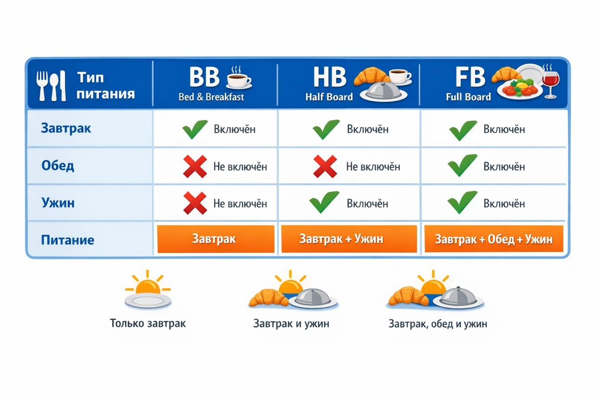 Часто, когда смотришь туры или отели, легко запутаться в аббревиатурах типа BB, HB, AI… .