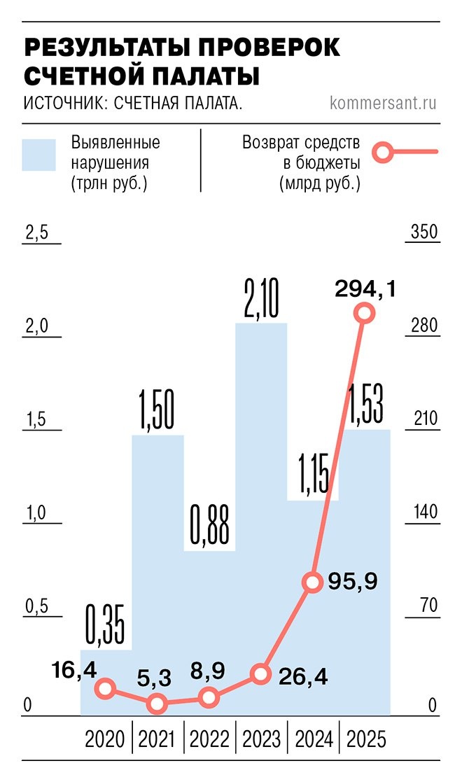Бюджетный эффект от проверок Счетной палаты в 2025 году вырос в 4,4 раза — до 653 млрд рублей. Возврат средств в бюджеты всех уровней и различные организации составил 294,1 млрд рублей, что стало рекордным результатом в истории работы СП.