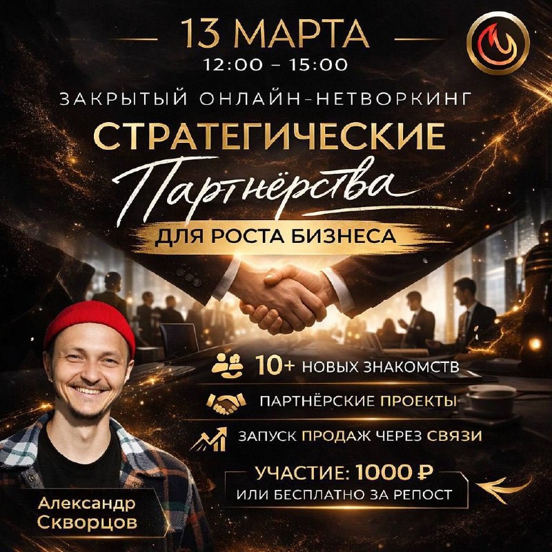 СТРАТЕГИЧЕСКИЕ ПАРТНЁРСТВА ДЛЯ РОСТА БИЗНЕСА 🤝 13 МАРТА | 12:00–15:00 | ОНЛАЙН Мероприятие для предпринимателей, которые понимают: масштаб начинается со связей. В бизнесе есть уровень, где: — клиенты приходят через рекомендации — запуски усиливаются партнёрскими интеграциями — выступления приводят новую аудиторию — собственные мероприятия становятся инструментом продаж И есть уровень, где вы делаете всё в одиночку. 📌 13 марта мы будем говорить о первом. 💡 О чём эта встреча Это не просто нетворкинг. Это пространство стратегического знакомства. Мы разберём: • Как выстраивать продвижение через партнёрства • Зачем объединять аудитории вместо конкуренции • Как превращать деловые связи в системный источник дохода • Почему собственные мероприятия усиливают продажи 🚀 Формат работы В течение 3 часов вы: — Познакомитесь минимум с 10 предпринимателями/экспертами — Найдёте потенциальных партнёров для совместных проектов — Запустите проект по набору 50–100 подписчиков — Определите ф