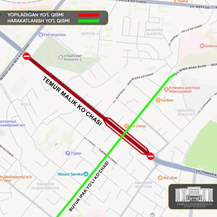 Согласно опубликованной информации, для движения всех видов автотранспорта временно закрывается участок улицы Темура Малика - от пересечения с улицей Мирзо Улугбека до пересечения с улицей Султония. При этом движение по улице Буюк ипак йули сохраняется, однако временно закрываются съезды и выезды с улицы Буюк ипак йули на улицу Темура Малика. Указанные меры будут действовать до полного завершения необходимых работ.