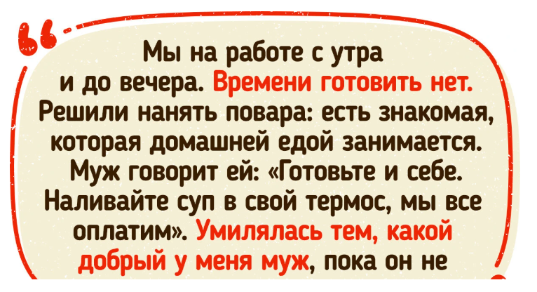 - Мы с мужем каждый день на работе, с утра и до вечера трудимся, а дома тринадцатилетняя дочь. Времени что-то готовить нет вообще, она еще сама не готовит, максимум бутерброды сделает. Решили мы нанять повара: есть знакомая, которая домашней едой занимается, мини-обеды делает, типа для кейтеринга. И муж всегда говорит знакомой: «Готовьте и себе. Обязательно! Вы домой придете, а вам тоже надо своих детей кормить. А когда вам этим заниматься? Поэтому наливайте суп в свой термос, в контейнер набирайте чего хотите. Пожалуйста. Только готовьте побольше, с расчетом и на себя. Мы все оплатим!» Я умилялась тем, какой добрый у меня муж, пока он не сказал, что это для того, чтобы она вкуснее готовила. С расчетом на то, что готовит не только для нас, но и для себя.
