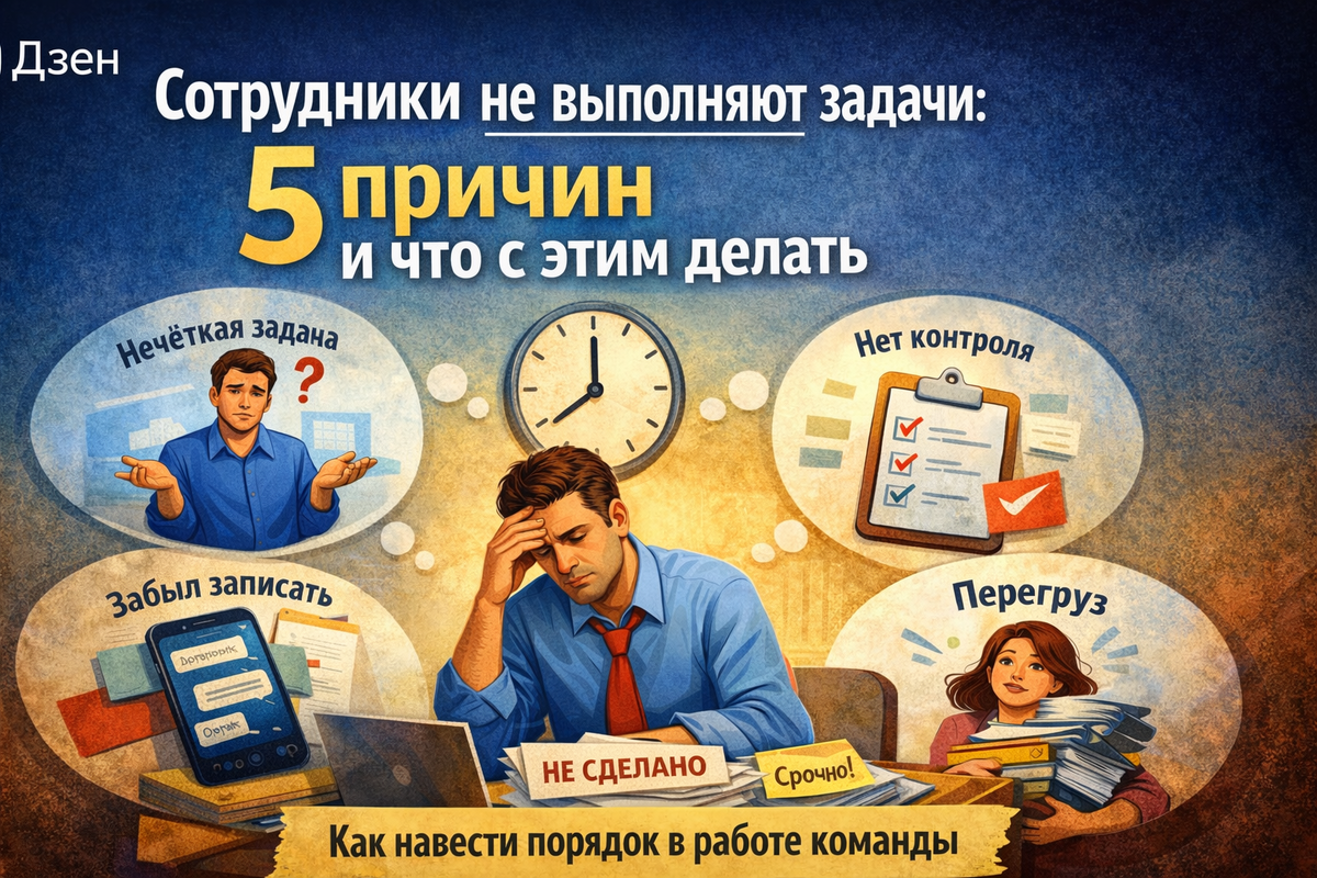 Вы поставили задачу. Через неделю спрашиваете - не сделано. Ставите снова. Через две - опять ничего. Сотрудник кивает, обещает, находит причины. А результата нет. Первая реакция «мне попались не те люди». Но по данным Gallup (2024), 70% вовлеченности команды зависит от руководителя, а не от самих сотрудников. В большинстве случаев проблема не в людях, а в том, как устроена система управления. Когда задачи не выполняются, руководители ищут проблему в людях: «ленивые», «безответственные». Но в 80% случаев причина в отсутствии системы. 1. Нечеткая постановка. «Подготовь отчет» - кому, к когда, в каком формате? Задача без критерия результата - это пожелание, а не задача. Сотрудник понимает ее по-своему, делает по-своему, а вы получаете не то, что хотели. 2. Задачи не фиксируются. Устное поручение в коридоре. Сообщение в чат, которое утонуло через час. Все, что не записано - не существует. 3. Нет регулярного контроля. Поставили задачу в понедельник, вспомнили в пятницу. Без точек контроля с