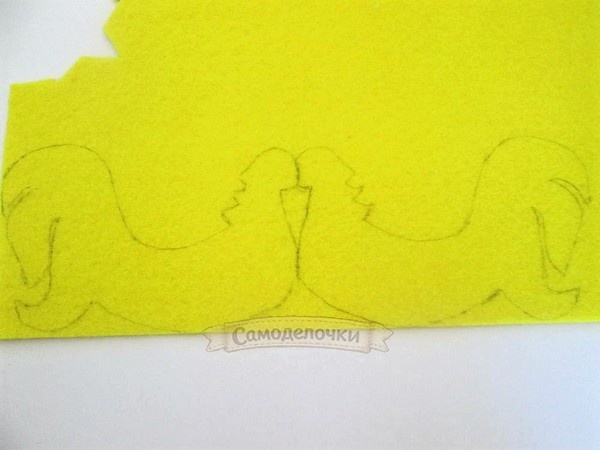 1. Нарисуйте или распечатайте этот шаблон. Переносим контур петушка на фетр жёлтого цвета. В итоге должно получиться два силуэта, но это будет одна сплошная деталь. 2. Рисуем на фетре красного цвета носик, бородку и гребешок. 3. Далее вырезаем детали красного цвета. 4. Аккуратно вырезаем одну деталь – тело петушка жёлтого цвета. 5. Делаем надрезы на обеих половинках. С одной стороны разрезаем верхнюю часть, с другой стороны нижнюю. 6. Вкладываем два разрез