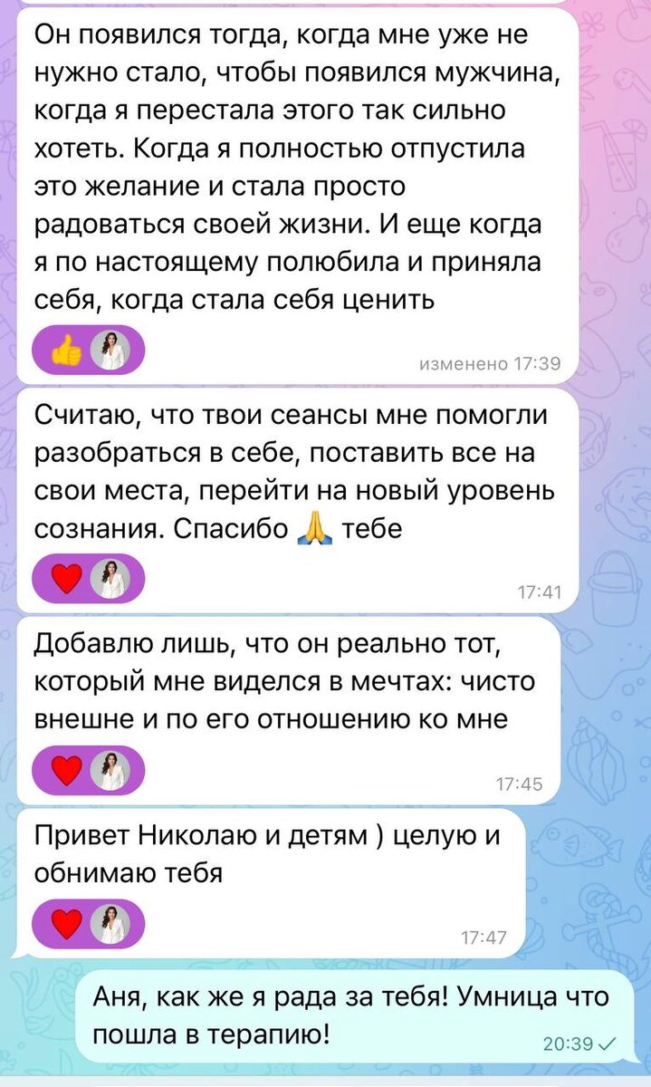 Прошло всего 4 месяца после сессии — и человек уже живёт новой жизнью, чувствует уверенность и внутреннюю свободу. Она написала: «Он появился тогда, когда мне уже не было так важно, чтобы появился мужчина.