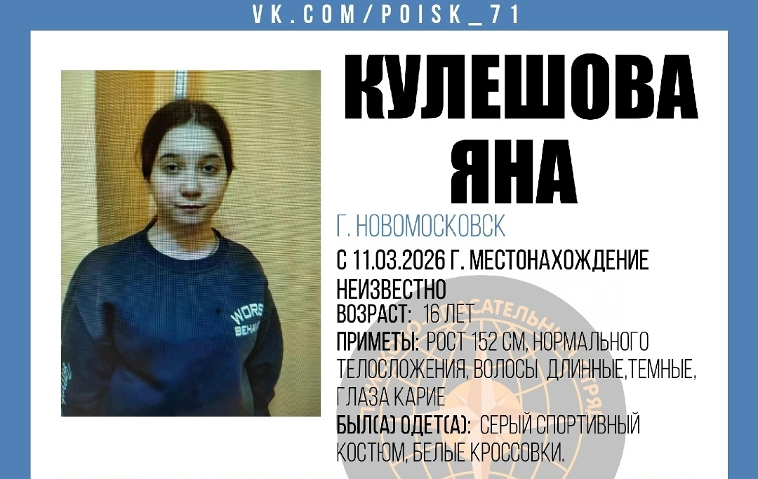 В Новомосковске разыскивают 16-летнюю Яну Кулешову. С 11 марта 2026 года ее местонахождение неизвестно, сообщили волонтеры поискового отряда «Поиск 71». Приметы пропавшей: рост 152 сантиметра, нормальное телосложение, длинные темные волосы, карие глаза. В день исчезновения была одета в серый спортивный костюм и белые кроссовки. Всех, кто обладает информацией о местонахождении девочки, просят звонить по номеру 8 (902) 900-26-15 или в службу спасения по телефону 112.