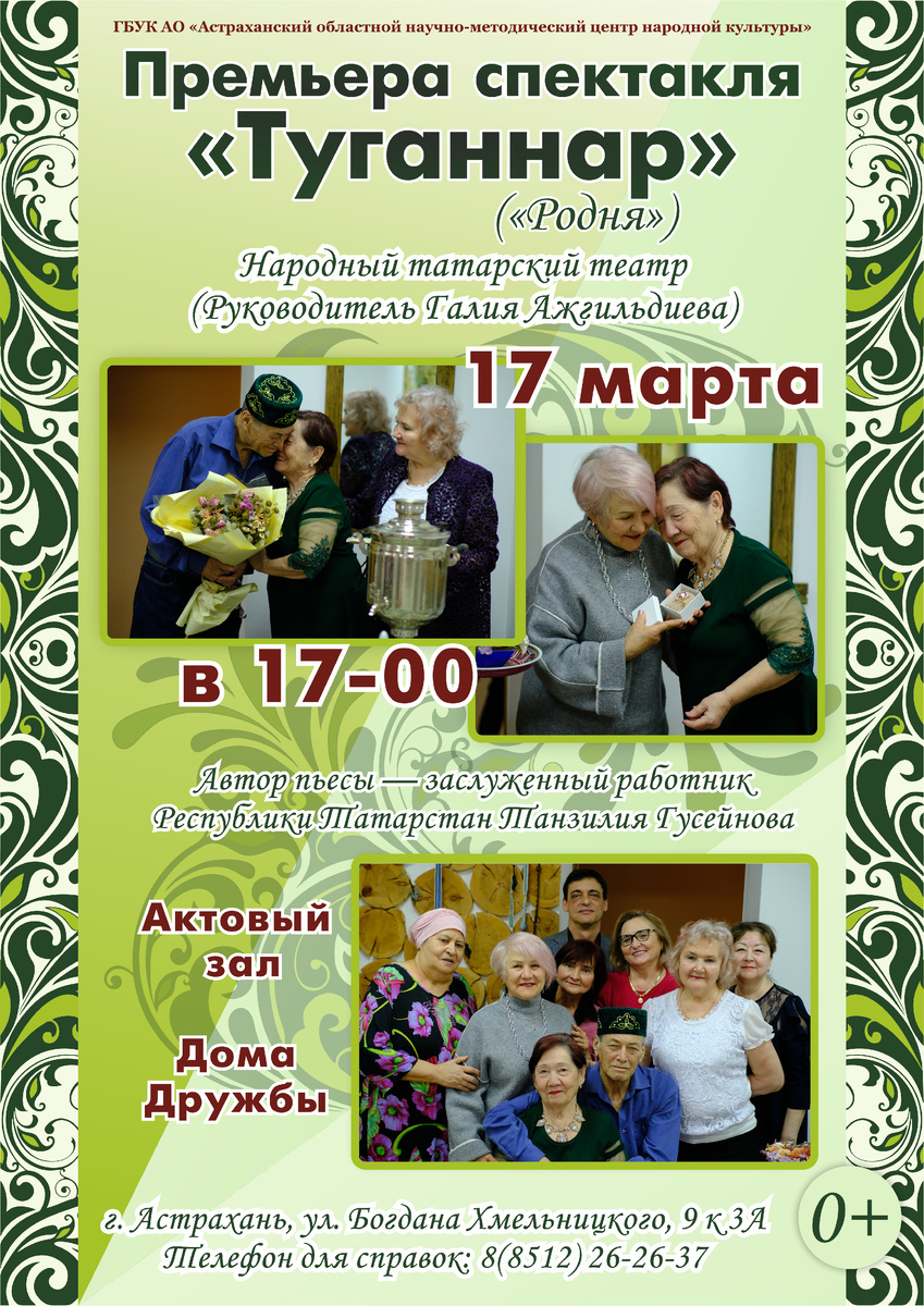 В основе сюжета одноактного спектакля — день рождения главной героини, простой астраханской женщины. Это событие пронизано диалогами с родными и близкими людьми, в которых главные темы — семья, забота, любовь, ответственность, то есть вечные человеческие ценности. Пьеса будет представлена зрителям в исполнении артистов народного татарского театра областного научно-методического центра народной культуры (руководитель Галия Ажгильдиева). Начало спектакля в 17:00 Адрес: ул. Б. Хмельницкого, д 9, корп. 3А, телефон для справок: 8(8512) 26-26-37