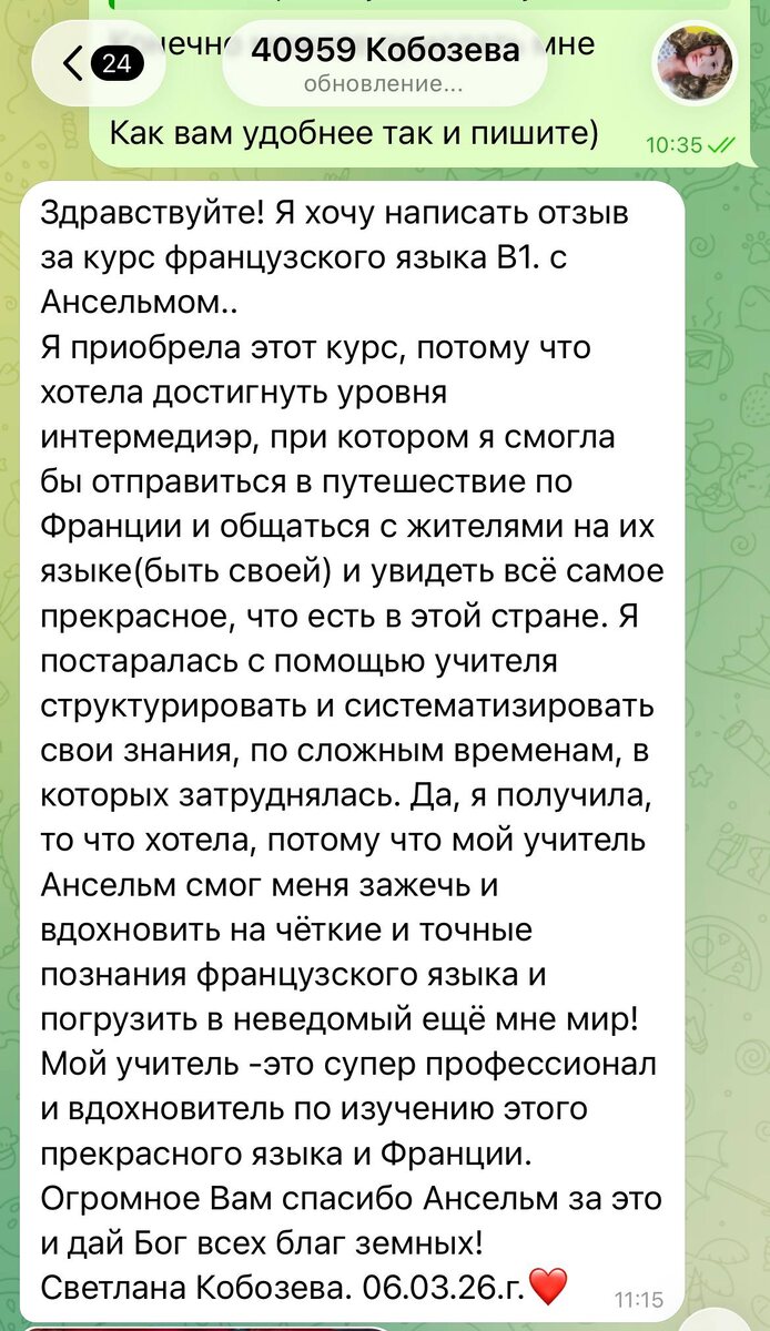 » Пока я осваиваю жизнь в другом конце света, пришло сообщение, от которого я замер. Светлана закончила курс В1 и написала это сообщение (прикладываю с ее разрешения) Знаете, что меня тронуло больше всего? Фраза: «быть своей» Я уверен, что Светлана когда-то тоже боялась и думала: «А вдруг не поймут?» А теперь она та, кто вдохновляет меня своей смелостью и готовность не просто говорить, а быть услышанным. Спасибо, вам Светлана. Вы — живое доказательство того, что любые изменения возможны! А вы уже чувствуете себя «своими» в каком-то языке? Или пока только мечтаете об этом чувстве? Делитесь 👇