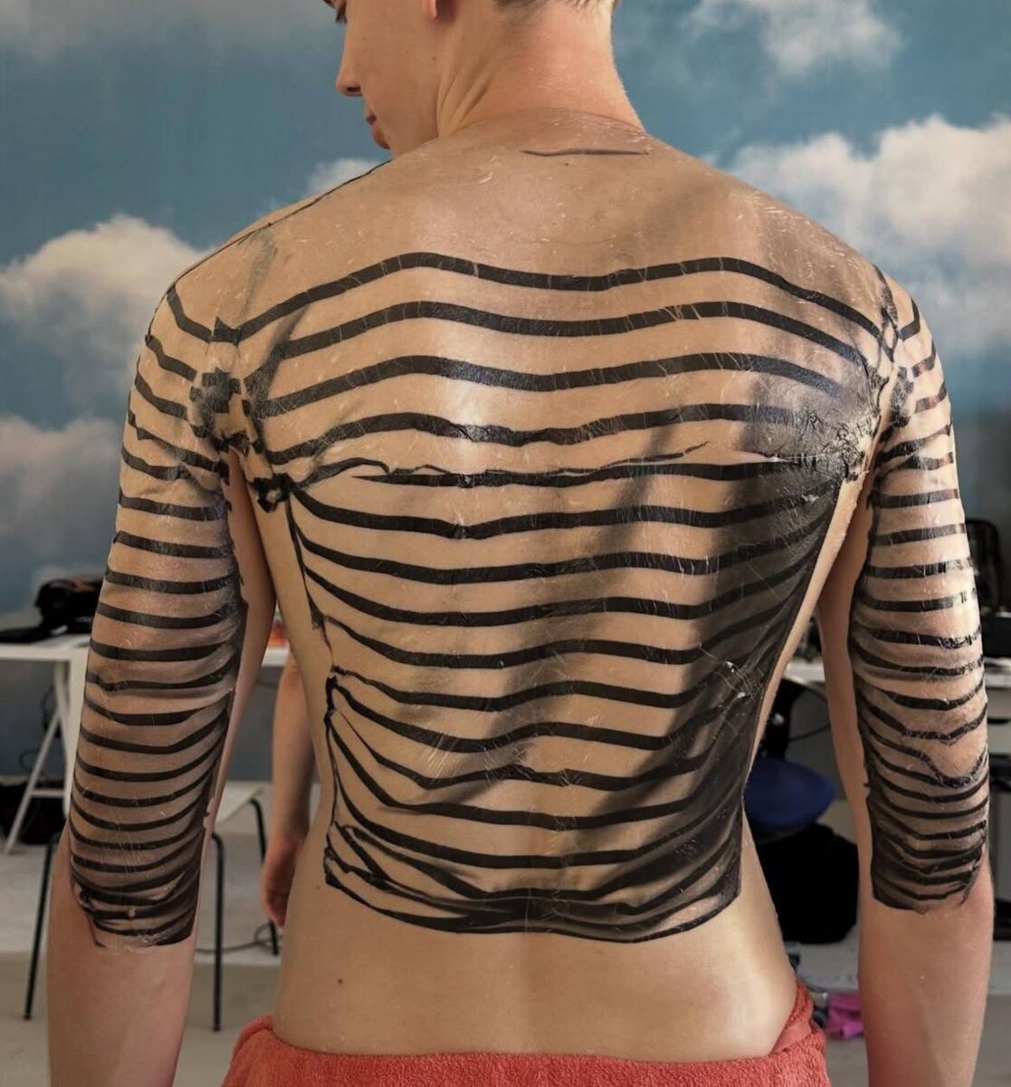 Это кожа. Во время PFW Tyla вышла в «змеиной» куртке — но одежды на ней не было. Это работа дизайнера Simon Carle. Он делает одежду из временных тату: ультратонкие принты наносятся прямо на тело и создают иллюзию кружева, корсета или кожи рептилии. Тело становится самой одеждой. Раньше Карл работал в Maison Margiela, а теперь его «вторая кожа» появляется на поп-звездах и в перформансах. Возможно, это одна из самых радикальных идей моды прямо сейчас.