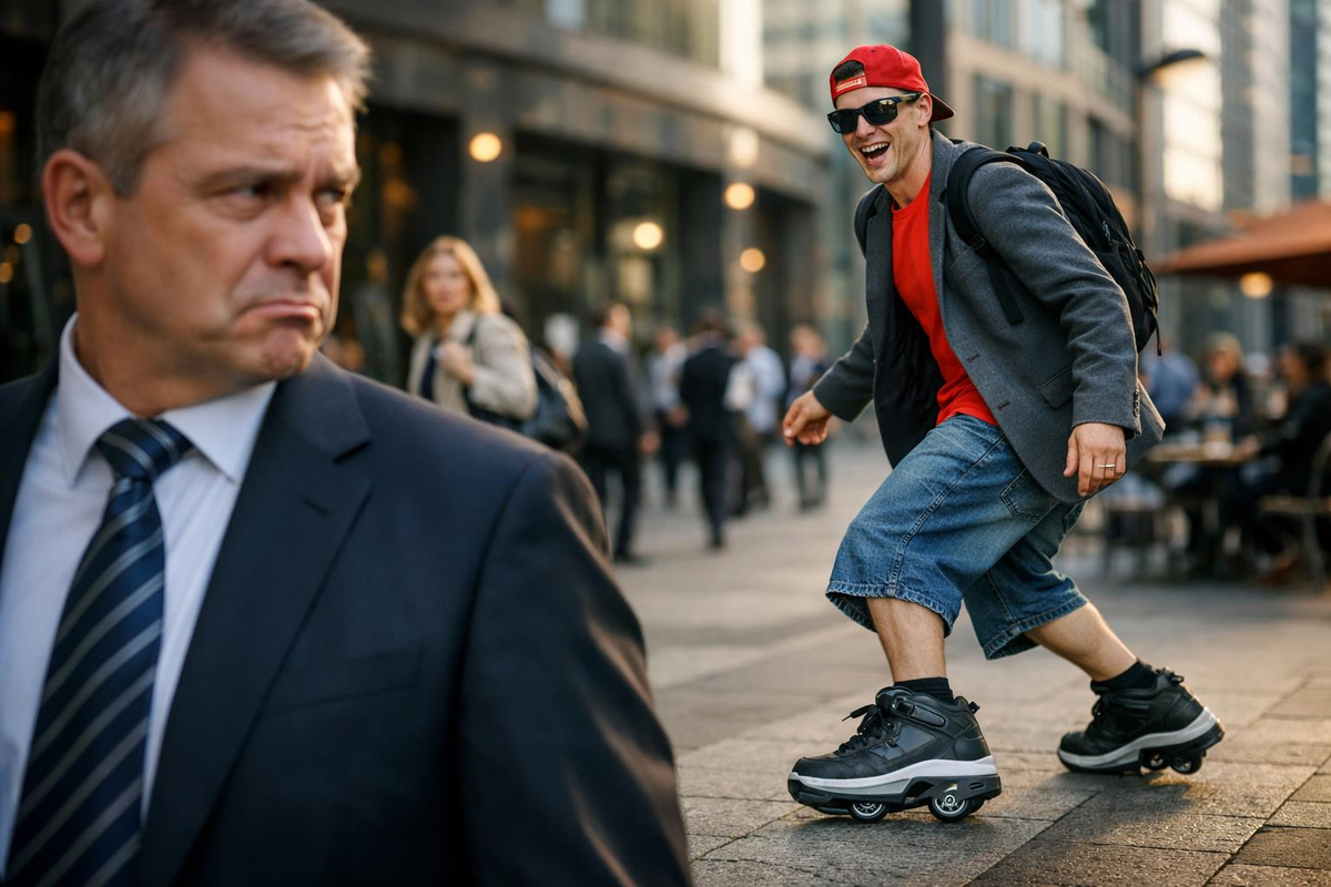 Вчера в торговом центре я увидел сорокалетнего мужчину, который грациозно катился мимо витрин на кроссовках с колесиками. На нем был вполне приличный пиджак, в руках - пакет из дорогого магазина, но двигался он так, будто законы гравитации и офисного этикета на него не распространяются.