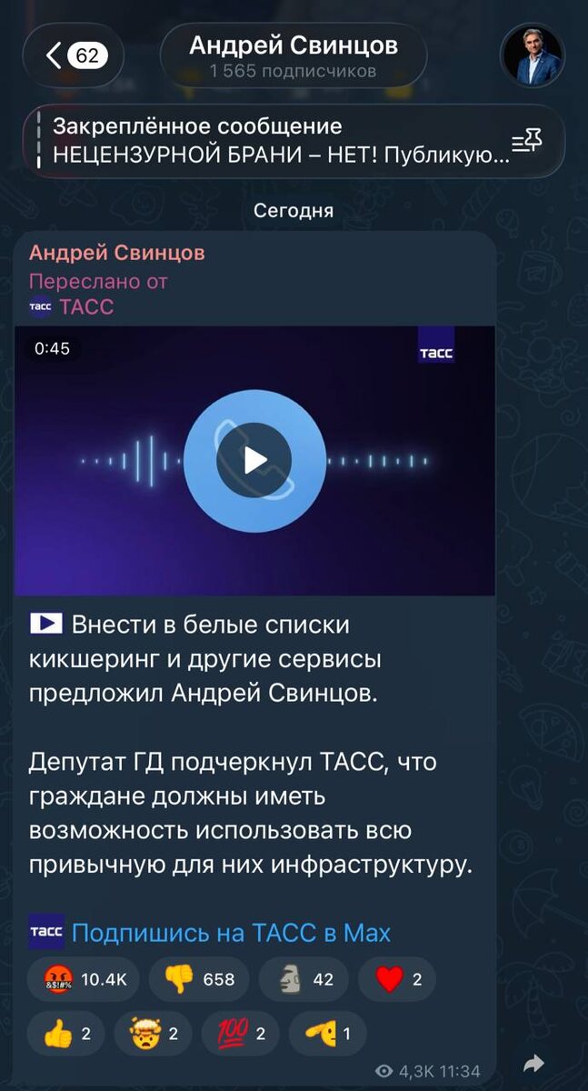 🤴 Также у товарища депутата есть канал в Telegram, где подписчиков раз в десять меньше, чем в запрещённой соцсети