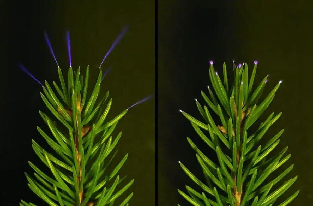 Мы привыкли считать, что электричество во время грозы — это молнии. Но основная электрическая работа может происходить тише и незаметнее. Исследователи из Северной Каролины показали, как кроны деревьев во время грозы покрываются тысячами коронных разрядов. Излучение такого разряда лежит в ультрафиолетовом диапазоне, поэтому человеческий глаз его не видит. Чтобы зафиксировать явление, ученые создали специальную систему наблюдения COTS с телескопом и камерой, чувствительной к УФ-диапазону 255–273 нм. Во время реальной грозы прибор зарегистрировал сотни микроразрядов с силой тока около одного микроампера. Коронные разряды работают как природные ионизаторы воздуха. Ультрафиолетовое излучение расщепляет молекулы воды, образуя гидроксильные радикалы — активные частицы, которые разрушают метан, озон и другие атмосферные загрязнители. Получается, что во время грозы лес превращается в гигантский естественный ионизатор — распределенную систему очистки воздуха, работающую на энергии электрическог