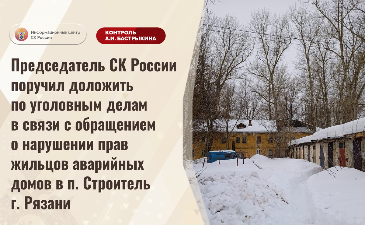Председатель СК России поручил доложить по уголовным делам в связи с обращением о нарушении прав жильцов аварийных домов в п. Строитель г. Рязани В комментариях в аккаунте приёмной Председателя СК России А.И. Бастрыкина в социальной сети «ВКонтакте» размещено обращение по вопросу нарушения прав жильцов аварийных домов в поселке Строитель города Рязани. Длительное время здания 1950-х годов постройки находятся в непригодном состоянии. Так, в доме на улице Дружной из-за несвоевременной очистки кровли от снежных масс произошло ее обрушение, в одной из квартир в доме на улице Предзаводской разрушились потолочные перекрытия. Пострадавших удалось избежать. В 2018 году строения признаны аварийными, однако мер к предоставлению гражданам благоустроенного жилья не принимается. Многочисленные обращения в различные инстанции результатов не принесли. Указанная ситуация освещается в сети Интернет. В СУ СК России по Рязанской области по данным фактам расследуется два уголовных дела. Председатель След