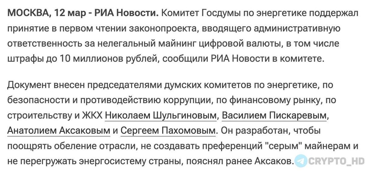 ) Комитет по энергетике поддержал законопроект в первом чтении. Цель – обелить отрасль и снять нагрузку с энергосистемы. Штрафы: ➠ Майнинг в регионах, где он запрещен: ▪Граждане = 100-150k рублей. ▪Должностные лица и ИП = 300-800k рублей. ▪Юрлица = 1-2m рублей. ➠ Майнинг без реестра или с превышением лимита энергопотребления: ▪Граждане = 100–150k рублей. ➠ Сокрытие данных о майнинге от ФНС: ▪Граждане = 100-200k рублей. ▪Должностные лица = 200-300k рублей. ▪ИП = 300-400k рублей. ▪Юрлица = 400-500k рублей. ➠ Незаконный майнинг неуполномоченными лицами: ▪Должностные лица = 200-300k рублей. ▪ИП = 300-400k рублей. ▪Юрлица = 400-500k рублей. ➠ При повторных нарушениях: ▪Граждане = до 1,5m рублей. ▪Должностные лица и ИП = до 5m рублей. ▪Юрлица = до 10m рублей. Альтернативные санкции – дисквалификация до 2 лет или приостановка деятельности до 90 дней. Crypto Headlines