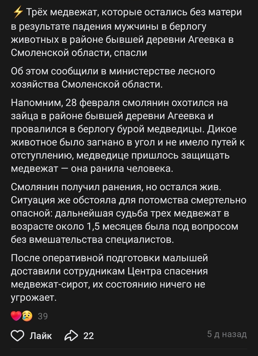 А это обсуждение в ТГ недавнего случая встречи с медведями в Смоленской области https://t.me/nika_zubra/20603