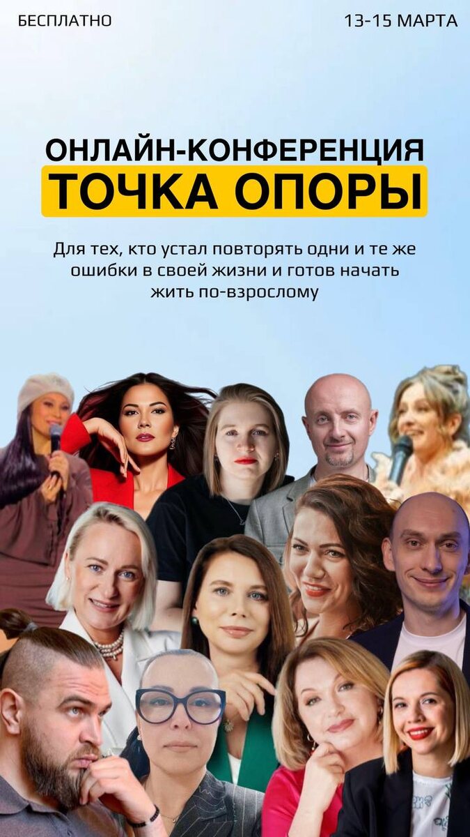 «Точка опоры. Психология для взрослых» 🗓 13 марта | онлайн | бесплатно Я тоже выступаю на этой конференции с темой: 🔥ОТНОШЕНИЯ. СЕМЕЙНЫЕ СЦЕНАРИИ И ВНУТРЕННЯЯ ОПОРА ЖЕНЩИНЫ🔥 Это будет не про абстрактную психологию и не про «позитивное мышление» Эта конференция про то, как взрослому человеку выстроить внутреннюю опору, чтобы перестать жить в постоянном напряжении, сомнениях и эмоциональных качелях в наше нестабильное время На конференции будем говорить о важных вещах: 🔺 почему мы снова и снова попадаем в одни и те же жизненные сценарии 🔺 как выйти из состояния тревоги и внутренней нестабильности 🔺 где женщина теряет энергию и уверенность 🔺 как принимать решения из ясности, а не из страха 🎙 В конференции участвуют более 10 экспертов и практиков,которые работают с глубинными причинами, а не с поверхностными советами. Я ОФИГЕЛА, когда увидела состав спикеров! 🎁 БОНУСЫ ДЛЯ УЧАСТНИКОВ сразу после регистрации 📎 Воркшоп «Стратегический план 2026 года по созданию новой идентичн