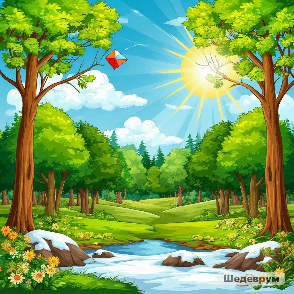 Весна никак не могла договориться с зимой. Солнце припекало всё жарче, но по утрам ещё прихватывало лужи тонким ледком, а в тени оврагов упрямо лежал последний, потемневший снег. Зима не хотела уходить, цеплялась за каждый холодный уголок. Масяня сидела на пригорке и смотрела в небо. Там, высоко-высоко, ещё кружились последние зимние облака, а ниже уже плыли весенние, пушистые и лёгкие. И тут её осенило: — А что, если отправить зиме послание? Попрощаться с ней по-хорошему, поблагодарить за снежные игры и попросить уступить место весне. Но как дотянуться до неба? Ответ пришёл сам собой — воздушный змей. Масяня созвала друзей и объявила о начале великой стройки. Материалы собирали всем миром. Бобёр Боря настрогал тонких, гибких лучинок из самого лёгкого дерева — осины. Они стали каркасом. Паук Шелкопряд со своей бригадой сплёл огромное полотно из самой прочной и лёгкой паутины — оно должно было стать «телом» змея. Белочка Белла принесла длинный, крепкий хвост из перьев, которые собр