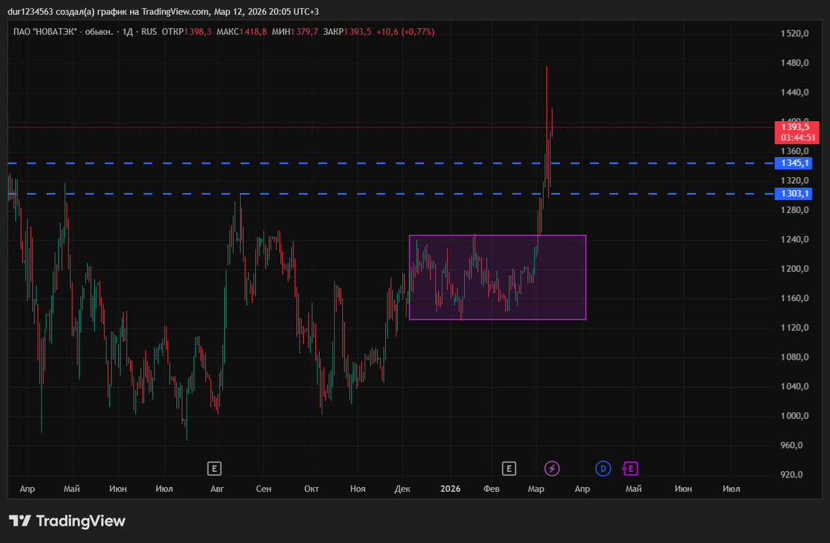 После пробития цены консолидации 1240 рублей акции «Новатэк» выросли на 18% 📈, и на этот момент их цена составляла 1419 рублей за акцию 💰. На данный момент акции просели на 6% 📉, и их цена составляет 1392 рубля. Моё мнение по ним такое 💭: сейчас я собираюсь зафиксировать часть прибыли ✅, а в дальнейшем ожидаю просадку еще на -3%, -6% 📉. То есть ожидаю просадку цены до 1345 и 1300 рублей 🎯, где в дальнейшем и буду принимать решения по этим акциям 🤔💪