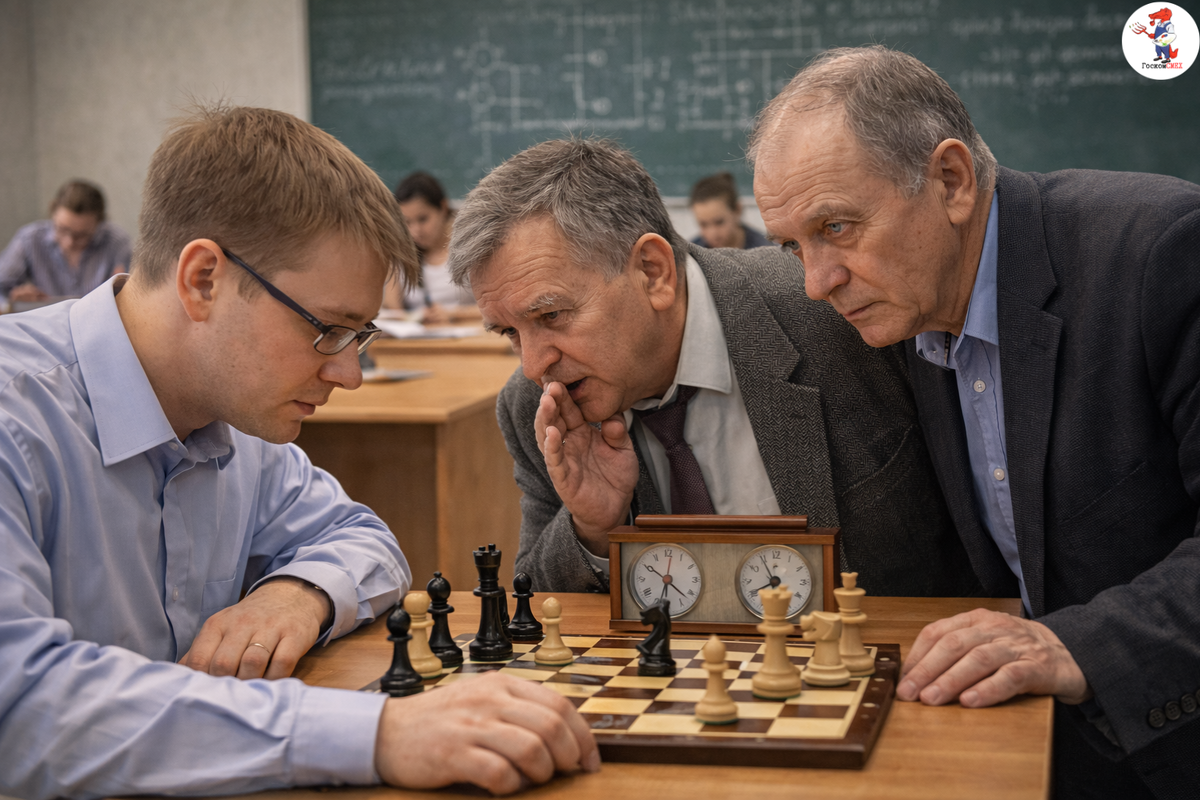 Это было давно. В те годы я часто играл в шахматы с Александром Владимировичем — моим преподавателем по теории обработки металлов. Играли регулярно, и успех был переменный: то он выигрывал, то я. Однажды, незадолго до экзамена, он говорит мне: — Давай так: на экзамене сыграем партию. Выиграешь — ставлю «пять». Ничья — «четыре». Ну а проиграешь — получишь «три». Надо сказать, я тогда был круглым отличником и получал повышенную стипендию. Перспектива схватить трояк на ровном месте меня, мягко говоря, не радовала. А Александр Владимирович был человеком слова: как скажет — так и сделает. Но и отступать было не в моих правилах. Я согласился. Настал день экзамена. Первые пять студентов сидят, готовятся по билетам, а мы с преподавателем уже разложили шахматную доску и ведём партию. Игра напряжённая, каждая фигура на счету. Но постепенно позиция начинает складываться в мою пользу. И тут в аудиторию заходит другой преподаватель — по электротехнике. Он ничего не говорит, просто подходит и начина