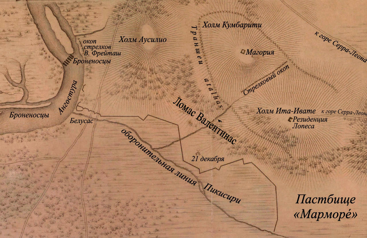 Эта оборонительная линия многократно превосходила по своей мощи знаменитые траншеи Курупайти. Британский инженер-подполковник Джордж Томпсон, состоявший на службе у парагвайского диктатора, спроектировал систему укреплений длиной 9,1 километра. Парагвайцы оборудовали 142 артиллерийские платформы, перекрывающие секторами обстрела все возможные подходы. Геометрия позиции превращала ее в смертельную ловушку для любой наступающей армии. Правый фланг линии опирался на широкую реку Парагвай, которую контролировали тяжелые береговые орудия форта Ангостура. Левый фланг уходил в непроходимые топи лагуны Ипоа и прикрывался бастионом Ита-Ивате, возведенным на холме с отвесными склонами.