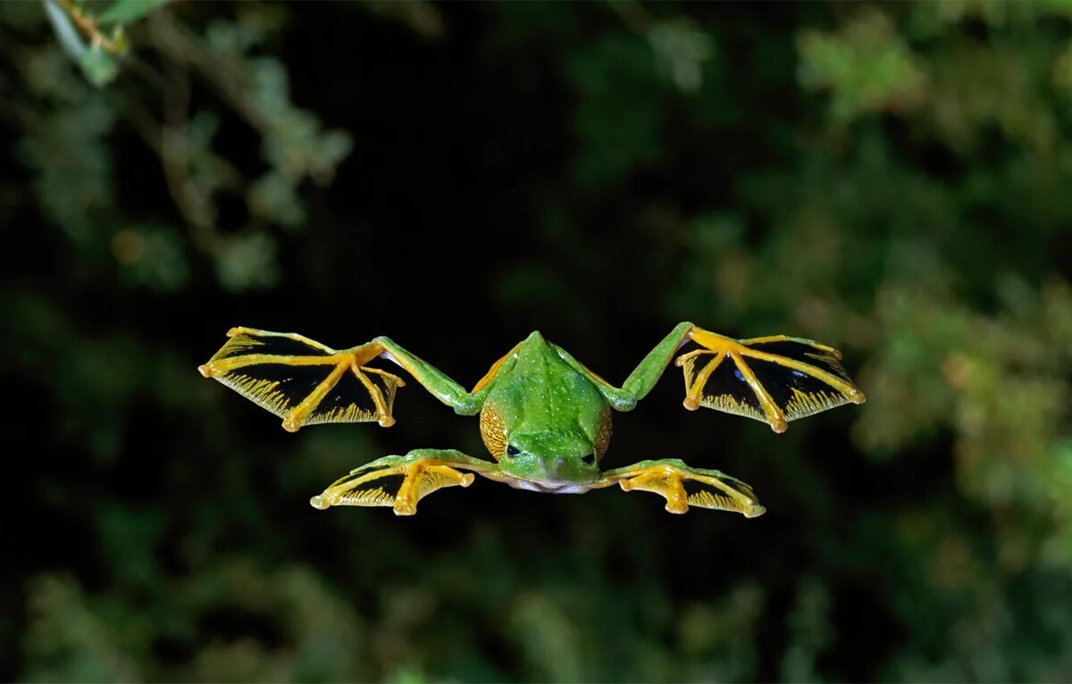 Главное средство защиты и передвижения этой лягушки – это ее способность к планированию. Когда ей нужно переместиться с одного дерева на другое, или спастись от хищника, она прыгает с высоты, расправляя свои перепончатые лапы. Эти перепонки увеличивают площадь поверхности тела, создавая подъемную силу и позволяя ей планировать на расстояние до 15 метров, а иногда и больше. Во время полета лягушка может маневрировать, изменяя положение своих конечностей.