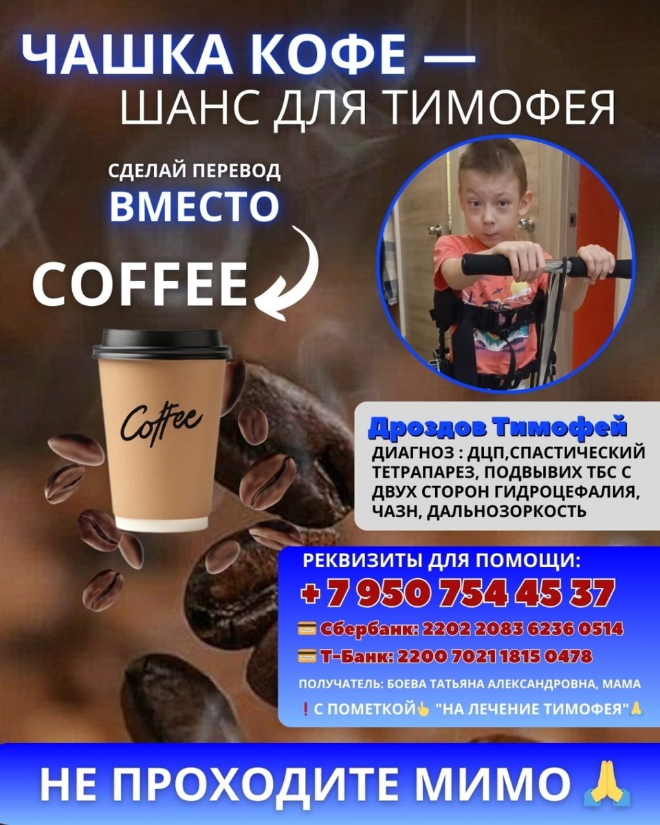 Друзья, у нас для вас очень простой и очень важный челлендж. Один глоток бодрит. Один глоток согревает. А один отказ от этого глотка может спасти жизнь. Давайте на одну чашку кофе станет меньше, а шансов на спасение у маленького Тимофея — на одну чашку больше! Тимоше 6 лет, и ему срочно нужна операция. Сумма сбора — 6 297 000 руб. Мы верим, что если в эту пятницу каждый из нас вместо того, чтобы купить капучино по пути на работу / домой, переведет эти стоимость чашки Тимофею, мы закроем сбор за считанные часы. 💰 ▎Суть акции проще некуда: 1️⃣ Вы хотели кофе? Откажитесь от него всего один раз. 2️⃣ Стоимость этой чашки (200, 300 рублей) переведите по реквизитам ниже. 3️⃣ Напишите в комментариях «😊», если сегодня пьете воду/чай, а кофе отдаете Тимофею. ▎📌 Реквизиты для помощи ☎️ По номеру: +7 (950) 754-45-37 ✅💳 Сбербанк: 2202 2083 6236 0514 messenger.online.sberbank.ru/sl/U7ZDStH... ✅💳 Т-Банк : 2200 7021 1815 0478 www.tbank.ru/cf/3P6tn1mcT9 ✍️ Сообщение: на лечение Тимофея 👩🦰 По