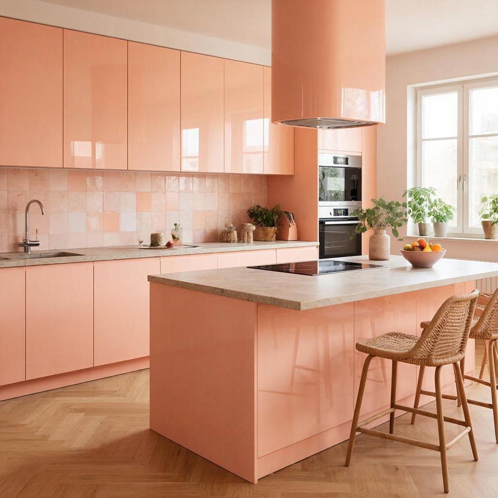 Персиковый — нежный оранжевый с большим количеством белого. Это мягкий, почти пастельный оттенок, который создаёт лёгкую, воздушную атмосферу. Персиковая кухня выглядит женственно и уютно, хорошо подходит для небольших помещений — не давит, а визуально расширяет пространство.