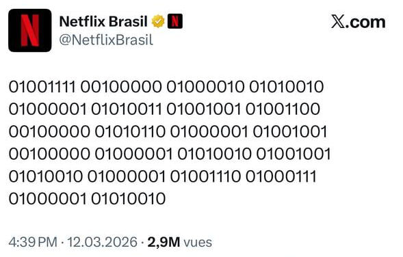🍃 Официальный аккаунт Netflix Brasil в X поделился бинарным кодом, который расшифровывается как "O Brasil vai Arirangar" - "Бразилия будет