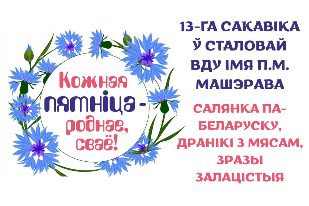 іх прыгатаваць? Ёсць рашэнне – прыходзьце 13 сакавіка ў сталовую ВДУ імя П.М. Машэрава і частуйцеся на здароўе! 🍜У рамках акцыі «Кожная пятніца – роднае, сваё» ў меню – надзвычай сытныя і смачныя нацыянальныя стравы – салянка па-беларуску, дранікі з мясам, зразы залацістыя. А калі дадаць да гэтага кампот ці гарбату, то атрымаецца паўнавартасны абед! 👋Запрашаем усіх ахвотных не проста смачна паесці, але і тым самым далучыцца да рэспубліканскай акцыі, пранікнуцца атмасферай адзінства і адчуць сваё, беларускае, роднае – тое, што ў сэрцы назаўжды. #анонсы #ДзеньРоднагаСвайго