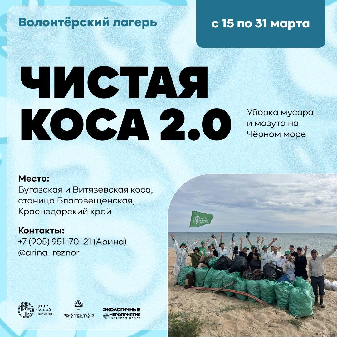 ) Центр Чистой Природы 12-15 приглашает волонтеров принять участие в волонтерском лагере для очистки Бугазской и Витязевской кос от штормового и замазученного мусора В прошлом году ребята трудились на этом месте во время ЧС пять месяцев и решили вернуться, чтобы помочь ставшему нам родным месту. Ведь миссия по очистке берегов Краснодарского края еще не завершена! 🗓 Даты проведения лагеря: с 15 по 31 марта 🙋 Что вас будет ждать? ♻️ Очистка побережья от мусора ♻️ Проживание и питание в станице Благовещенской за счет ЦЧП 12-15 ♻️ Сертификаты и часы на Добро.рф ♻️ Дружеская атмосфера и вдохновляющее общение ♻️ Фото- и видеоотчет ♻️ Компенсация проезда до 5000 рублей для первых 6 участников, которые пробудут с нами не менее 10 дней 📃 Условия для участия: ♻️ Возраст 18+ ♻️ Готовность к ежедневному труду И помните: количество мест ограничено! Готовы внести вклад в сохранение природы чистой вместе с командой единомышленников? Тогда регистрируйтесь по ссылке 🔗 Не можете посетить лаге