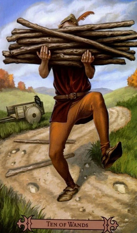 Если рекомендовать модель поведения, - то ничего не поделаешь, надо тащить этот крест. Совет при кризисе в отношениях: даже если ты не понимаешь, куда и ради чего надо нести этот груз, не видишь перспективы, не понимаешь, что могло бы вас объединять – ИДИ вперед, изо дня в день делай что должен («я всю жизнь тебе отдам, всю по каплям, по годам»), хотя бы и дойдя до предела своих возможностей. Вернись к дому, а не убегай, пусть это кажется тебе невыносимым. Кризис будет преодолен, есть смысл терпеть. Предостережение же карты звучит так: последняя соломинка, ломающая спину верблюда, у судьбы наготове. Может, скинешь эту ношу сам? Всех денег все равно не заработаешь, все дела все равно никогда не сделаешь и всем все равно не угодишь. Пора прекратить лезть из кожи вон. Отражая контрпродуктивную модель поведения в раскладе, она советует отказаться от обязанностей и задач, сбросить груз и найти время от удовольствия, отдыха и счастья. И вообще перейти от религии жертвенного самоистязания к
