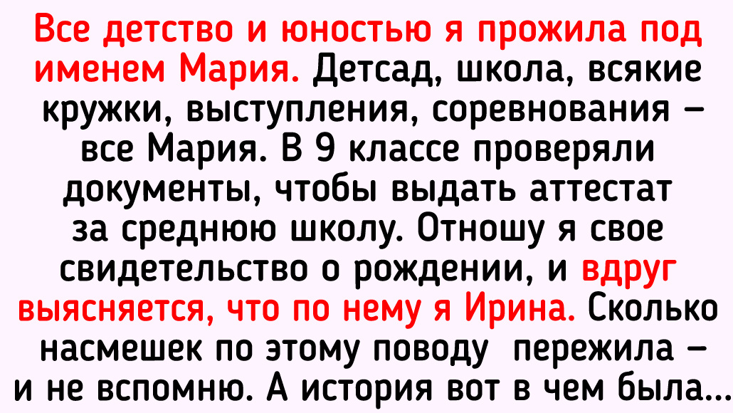 Все детство и юностью я прожила под именем Мария. Детсад, школа, всякие кружки, выступления, соревнования — все Мария. В 9 классе проверяли документы, чтобы выдать аттестат за среднюю школу. Отношу я свое свидетельство о рождении, и тут выясняется, что по нему я — Ирина. Сколько насмешек по этому поводу и обидных прозвищ на стыке двух имен пережила — и не вспомню.