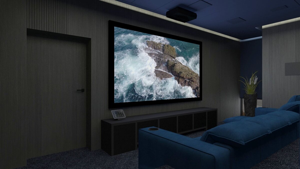 Название проекта: Медиарум в ЖК Событие Тип: Общественное пространство Место: г. Москва Авторы: Artinstall Звук: 7.4.4 Статус: Предварительное предложение Кинозал для жильцов в жилом комплексе – это формат, ставший популярным в последнее десятилетие в европейских странах. У нас такое пока редкость, поэтому мы были рады, когда к нам обратился застройщик ЖК в Москве с просьбой помочь с таким кинозалом. Для реализации выделено помещение на первом этаже в одном из корпусов. Под полноценный кинозал, соответствующий стандартам CEDIA, оно не подходило из-за маленькой площади и длины, наличия двух больших окон. Но и в таких условиях можно создать комнату с отличным звуком и картинкой, по общепринятой классификации относящуюся к медиарумам. У заказчика уже была концепция дизайну интерьера, мы ее адаптировали к кинотеатральной инженерии. На стенах – шпонированные акустические панели с перфорацией двух типов. Потолок – те же панели с покраской в глубоко синий оттенок, перекликающийся по цвету с к